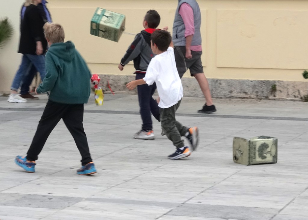 Τα παιδιά συνήθως δένουν στα ποδήλατα τους ή, κρατούν τα ίδια με ένα σχοινί μικρά τενεκεδάκια, ταψάκια, κουτάλες κτλ. και τρέχουν! Ενώ οι μεγαλύτεροι προτιμούν να οδηγούν το μηχανάκι τους, και πάντοτε δύο μαζί ώστε ο ένας να οδηγεί κι άλλος να κρατά το σχοινί, δένουν τενεκέδες από λάδι, βαρέλια ή και παλιοσίδερα και κάνουν βόλτες στις γειτονιές. Ο θόρυβος που δημιουργείται στους δρόμους είναι τόσο μεγάλος που δεν υπάρχει περίπτωση να μην ξεσηκωθεί κάποιος.