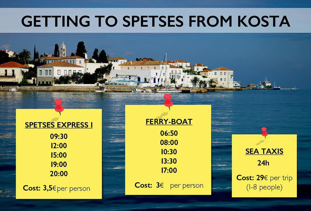 Από Κόστα, υπάρχουν οι επιλογές: Sea Taxi, Spetses Express Boats και Ferry-Boat.